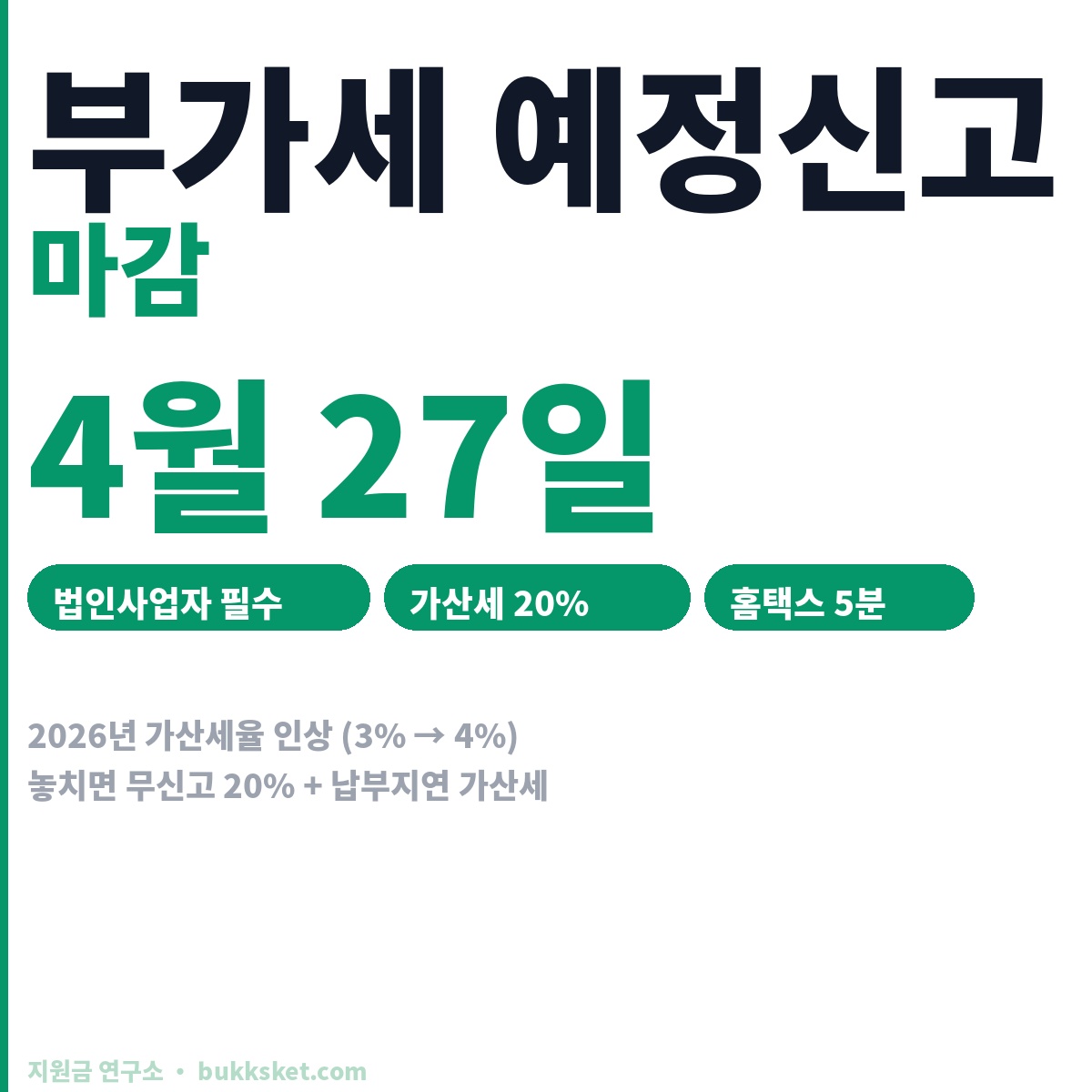 마감 4월 27일(월)까지 3일 남았습니다. 법인사업자는 부가세 1기 예정신고 필수!