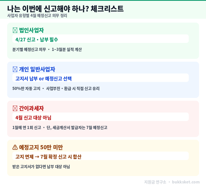 🚫 신고 대상 아닌 사람: 일반 개인사업자(고지서 납부만)·간이과세자(1월에 연 1회 신고)·예정고지 50만 원 미만(면제)