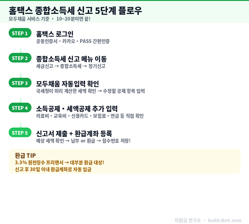 ▲ 홈택스 종합소득세 신고 5단계 플로우 (모두채움 기준)